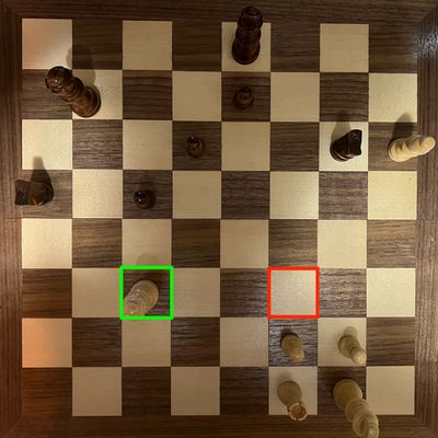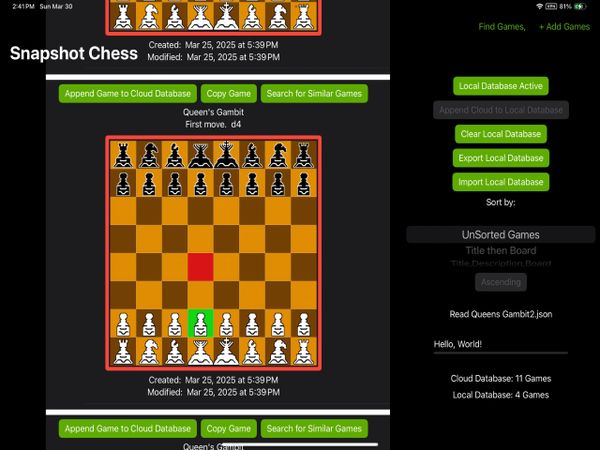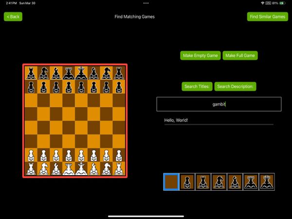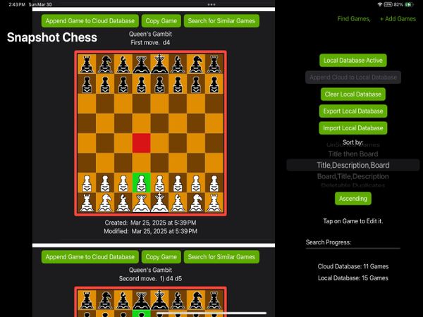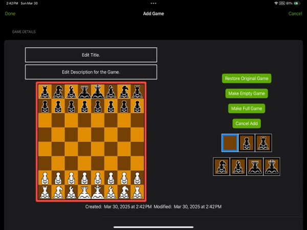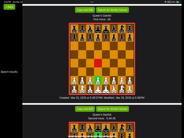 A scrollable chess board editing app which also has a summary title and descriptive description and a green and red background showing the move to make next.
