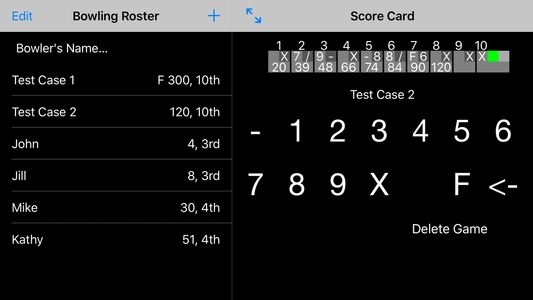 Now here is a simple Bowling Scoring App. Enter the bowler's name in the Bowling Roster then tap their name to see their Bowling Score Card. The key pad below the score card changes as the game progresses allowing only valid entries while the game in progress is being scored. A backspace key (<-) allows for easy changes and the entire game can be deleted with the touch of two keys.